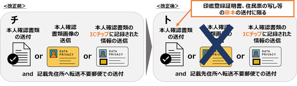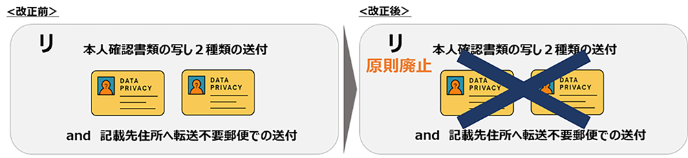また、用いられる本人確認書類が厳格化されており、改正後は印鑑登録証明書や住民票の写しの原本など公的機関が発行する偽造が困難な書類のみに限定されています。