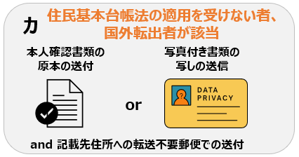 「本人確認書類の原本1点の送付 or 写真付き書類の写し1点(厚みその他の特徴&本人確認時に撮影されたもの)の送信 + 転送不要郵便物等 ※住民基本台帳法の適用を受けない者又は同法第17条第3号に規定する国外転出者が該当。」