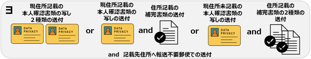 「住所記載の本人確認書類の写し1点の送付 or 本人確認書類1点の写しと住所記載の補完書類1点の送付 + 転送不要郵便物等」