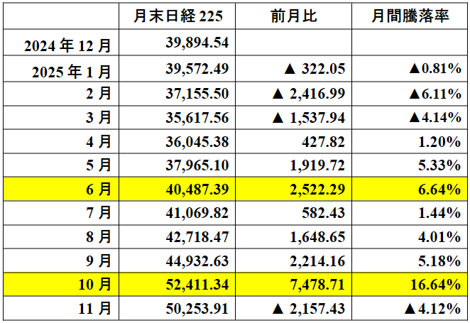4月の急落後は「貿易リスク後退観測」「AI・半導体などセクター期待」「為替動向(円安)」等の材料が交錯し、夏〜秋にかけて上昇基調が続きましたが、10月の「新政権への期待」による急騰後は調整圧力も強まりました。