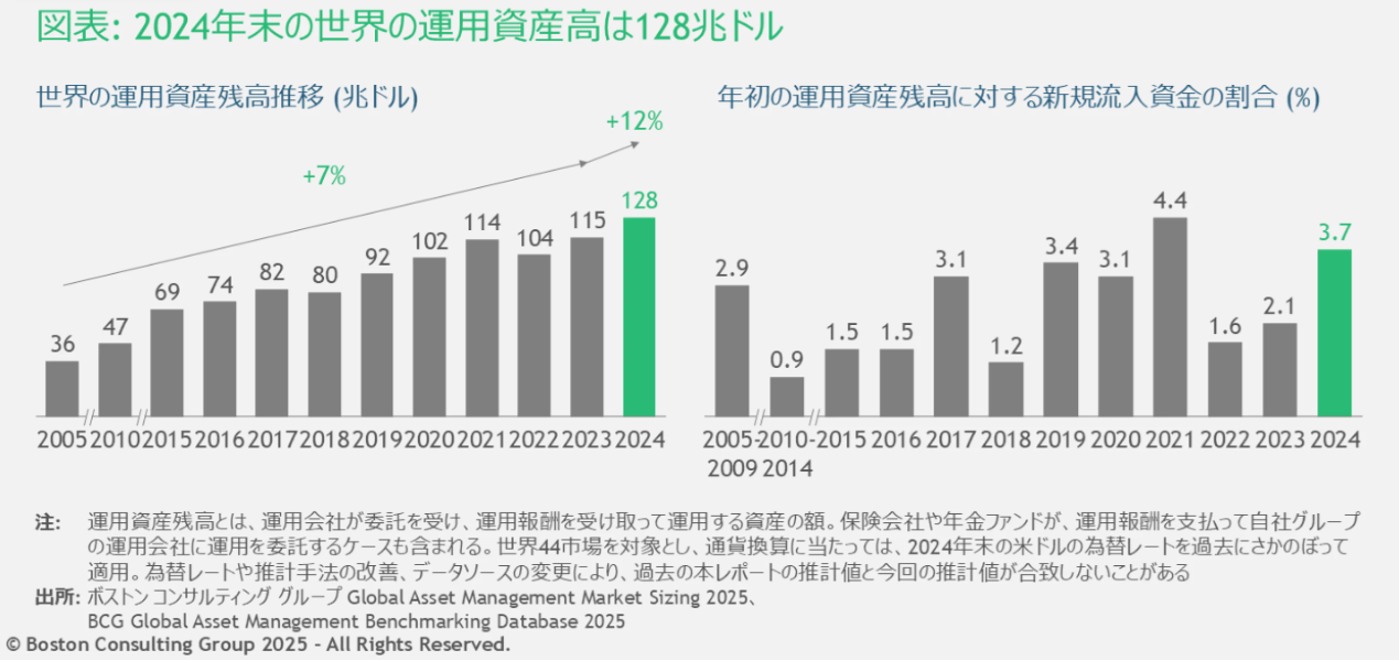 2024年末の世界の運用資産残高は128兆ドルと推計されます(図表)。2023年(115兆ドル)から12%増となり、過去最高額を記録しました。