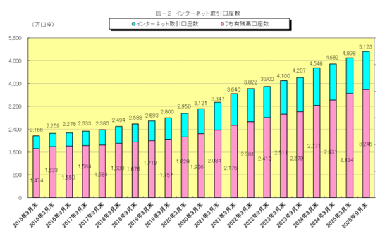 日本証券業協会が2025年12月に公表した「インターネット取引に関する調査結果(2025年9月末)」によれば、インターネット取引口座数は5,123万口座に達し、そのうち残高が1円以上ある有残高口座は3,246万口座、全体の63.4%を占めています。信用取引口座数も362万口座に上っています。