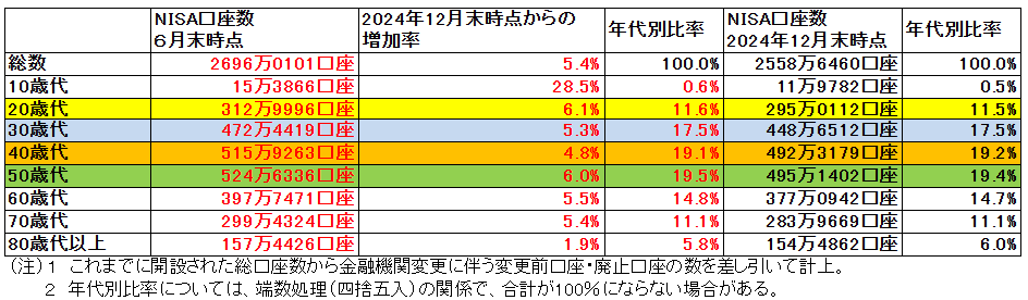 金融庁による「NISA口座の利用状況に関する調査」によりますと、2025年6月末時点での年代別NISA口座の開設状況は、下記のようで、二つの特徴がみられます。