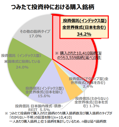 より詳細にみると、NISA全体のデータですが、積立投資枠においては73.8%がインデックス型に、そのうち50%強が日本を除く全世界株式型か米国株式型に投資されています。
