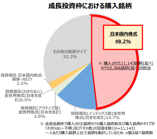 一方、成長枠投資枠においては48%が日本国内株式に投資されております。