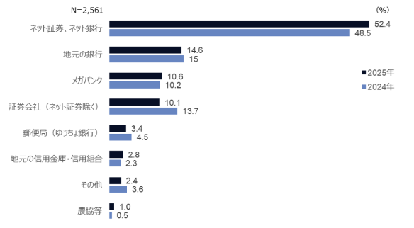 2025年3月にNTTデータ・エービックが実施した「NISA意向調査」の結果によると、NISA利用先として最も多いのはネット証券・ネット銀行で52.4%に達し、対面型証券会社は10.6%にとどまっています。