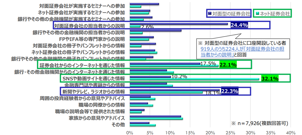 一方、ネット証券会社に口座開設している投資家は、「SNSや動画サイトを通じた情報」が32.1%と最も高く、次いで「証券会社からのインターネットを通じた情報」が22.1%と続いています。